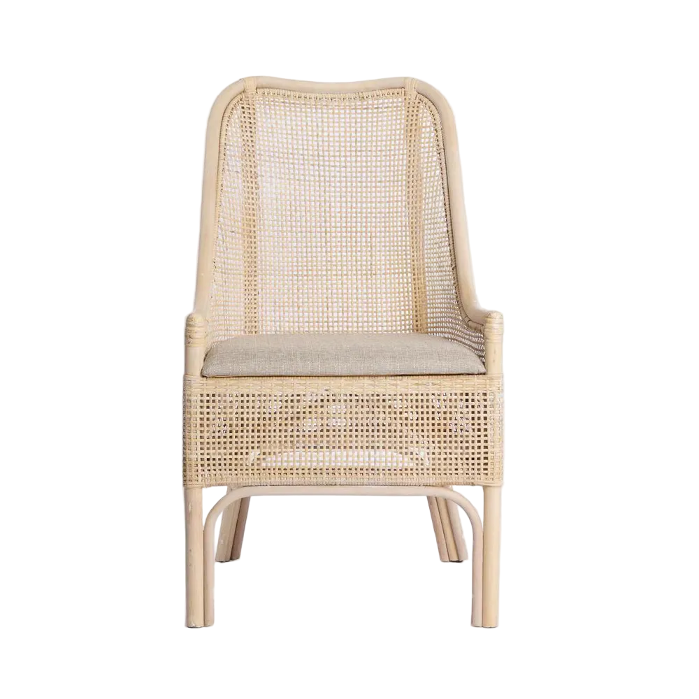 Introducing the Victoria Hamptons Dining Chair. Bringing a touch of coastal elegance to your dining area. Made from natural rattan, this chair boasts a high back and cushioned seat for ultimate comfort. The beautiful detailing and wrap around skirting add a luxurious finish to any stylish home.
