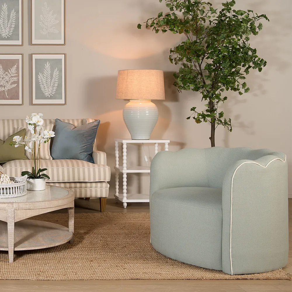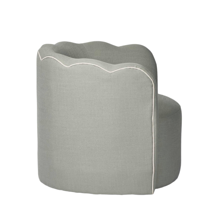 Invite coastal calm into your home with the Camille Armchair in Blue, a timeless piece that exudes both charm and comfort. It features a scallop back design reminiscent of ocean waves and contrast piping that adds a touch of sophistication. Whether nestled in a cozy corner, adorning a reading nook, or complementing a coastal-inspired living room, the Camille requires no assembly. With just a quick vacuum and wipe down, you'll be ready to relax in no time.