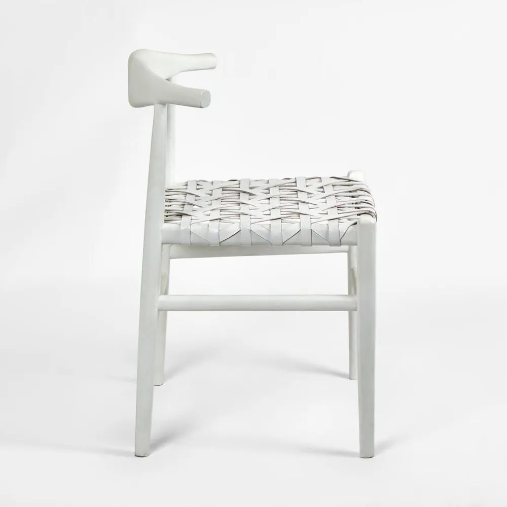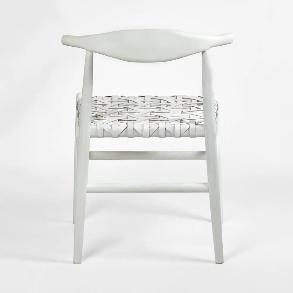 A perfect addition to any modern home, the Sorren Dining Chair features a stunning hand woven leather seat and an elegant low curved back. The teak wood hand-carved seat back and frame is finished in a matt white hand painted texture for a modern look. The supple leather has a softly worn waxed finish, developing a unique patina over time. Its a versatile choice that complements a wide range of dining spaces. Ideal for modern, minimalist or Scandinavian inspired dining rooms where simplicity and elegance are highly valued. Over time leather will develop its own unique patina. Wipes easily clean.