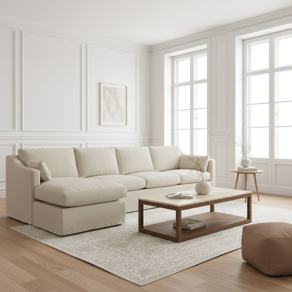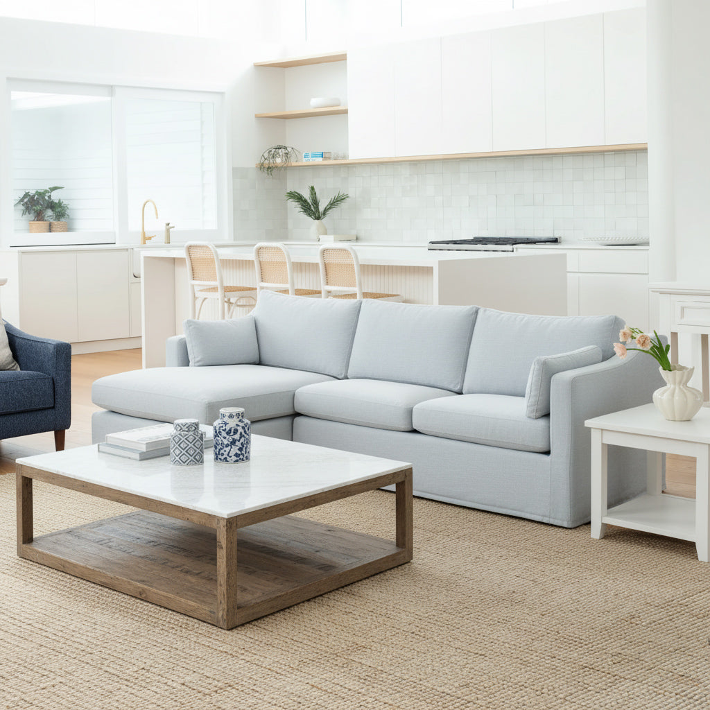 Introducing the Clovelly sofa, where luxurious lounging meets coastal elegance. With a spacious right chaise design and natural color, it adds a touch of refinement to any living space. Relax in style with three seats and extra comfort from the chaise. Elevate your home with the exclusive Clovelly sofa.