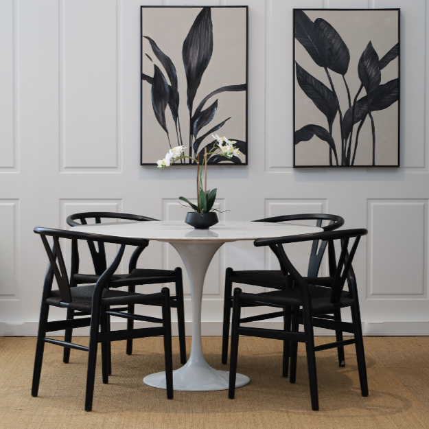 Introducing our Aurora 5 Piece Dining Package, featuring a stunning Oval Dining Table in Marble White and 4 Atlas Black Dining Chairs. Experience luxurious dining with this exclusive set, perfect for elegant gatherings and exquisite culinary experiences. Upgrade your dining space with Aurora.