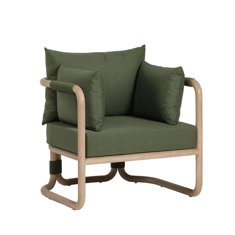 Crafted from solid eucalyptus wood and handwoven rope detailing, the Vita Armchair embodies contemporary elegance with a natural warmth. Its smooth, rounded frame contrasts beautifully with forest green cushions, creating a refined balance of form and comfort. It’s clean, versatile design complements the Vita Coffee Table, Side Table & Sofa, creating a stylish, cohesive look.