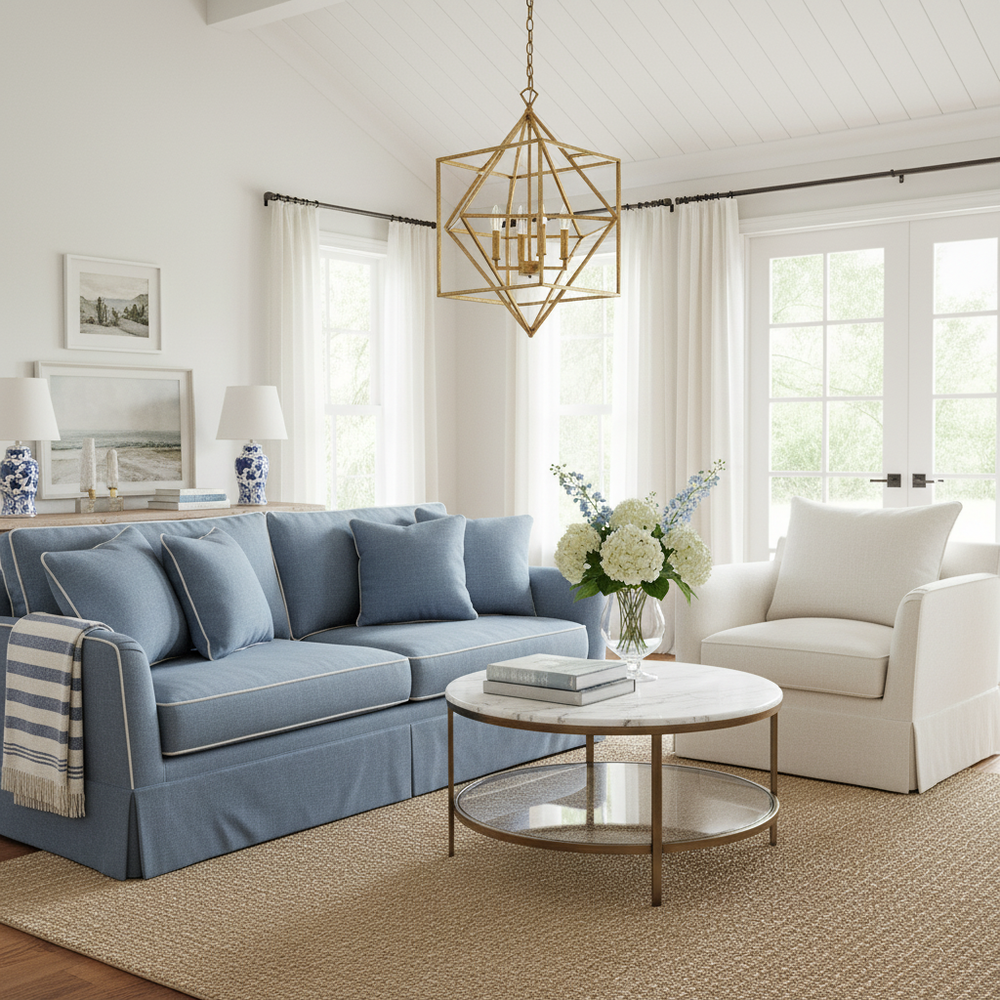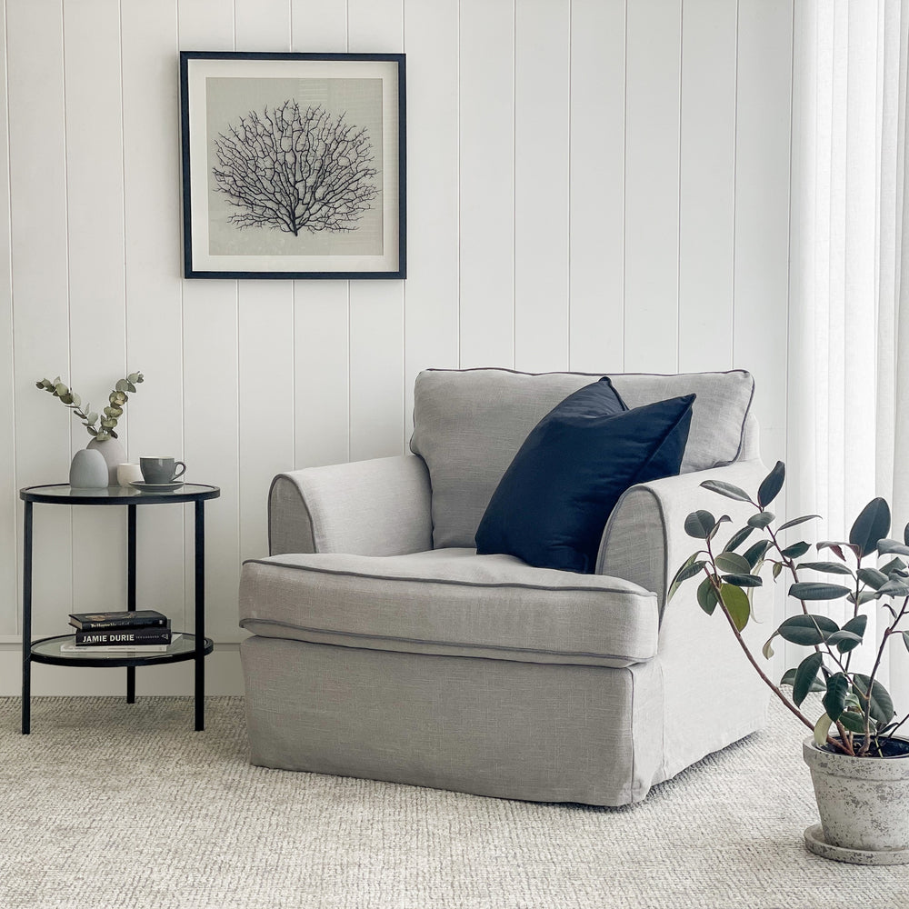 The living room should be an area of comfort for every household member. Sink back and relax with our contemporary yet classically Hamptons sofas . Or curl up with a book in one of our Hamptons armchairs. Upholstered in neutral colours and tones, they complement our wooden and white coffee tables and storage units such as bookshelves and console tables.