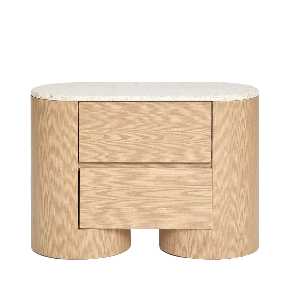 Arlo Bedside crafted in natural oak veneer with a terrazzo stone top. The rounded ends and seamless drawer fronts create a soft, modern silhouette, while the natural textures bring warmth and refinement.