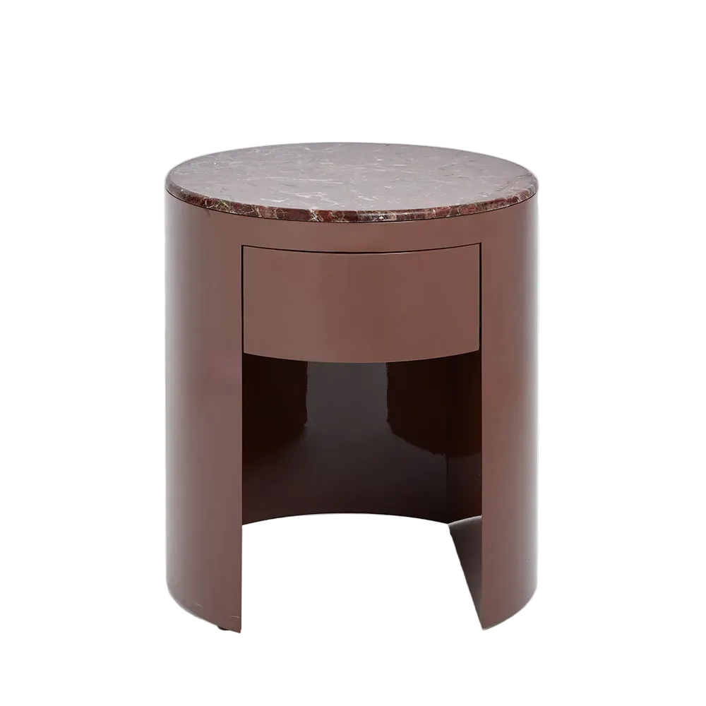 A refined side table featuring a curved lacquered base and a honed marble top with rich, organic veining. Designed with a soft silhouette and concealed drawer, this piece pairs sculptural elegance with practical sophistication — perfect as a bedside or accent table.
