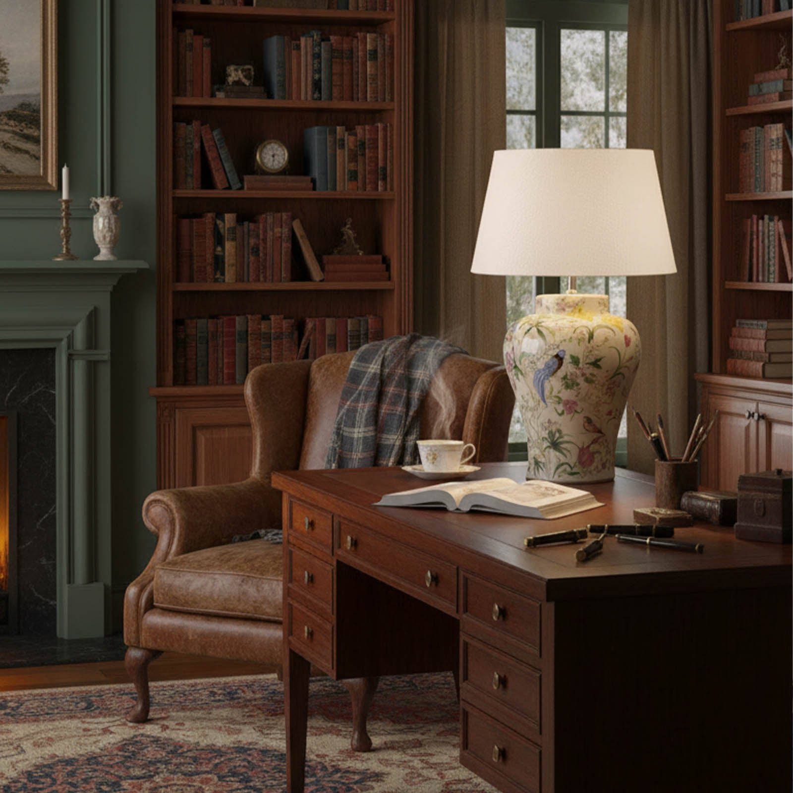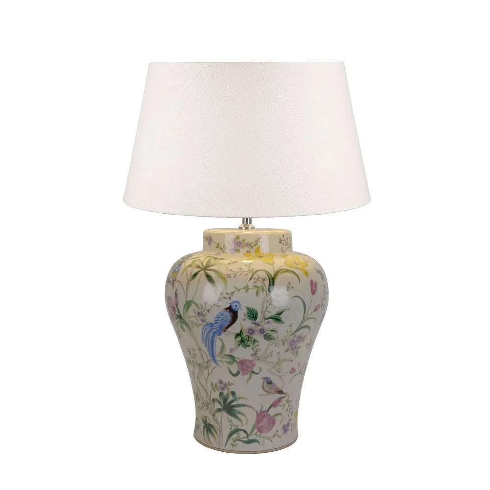 Our Raffles is charming large oriental ceramic base table lamp and has glazed ceramic base in the classic ginger jar style. The lamp is painted with bird and leaf motif on ivory white background. This is elegant lighting for traditional interiors in delightful mix of colours and perfect to sit on center of console table in living or family room.