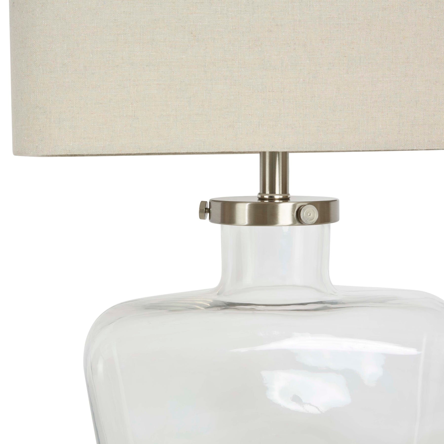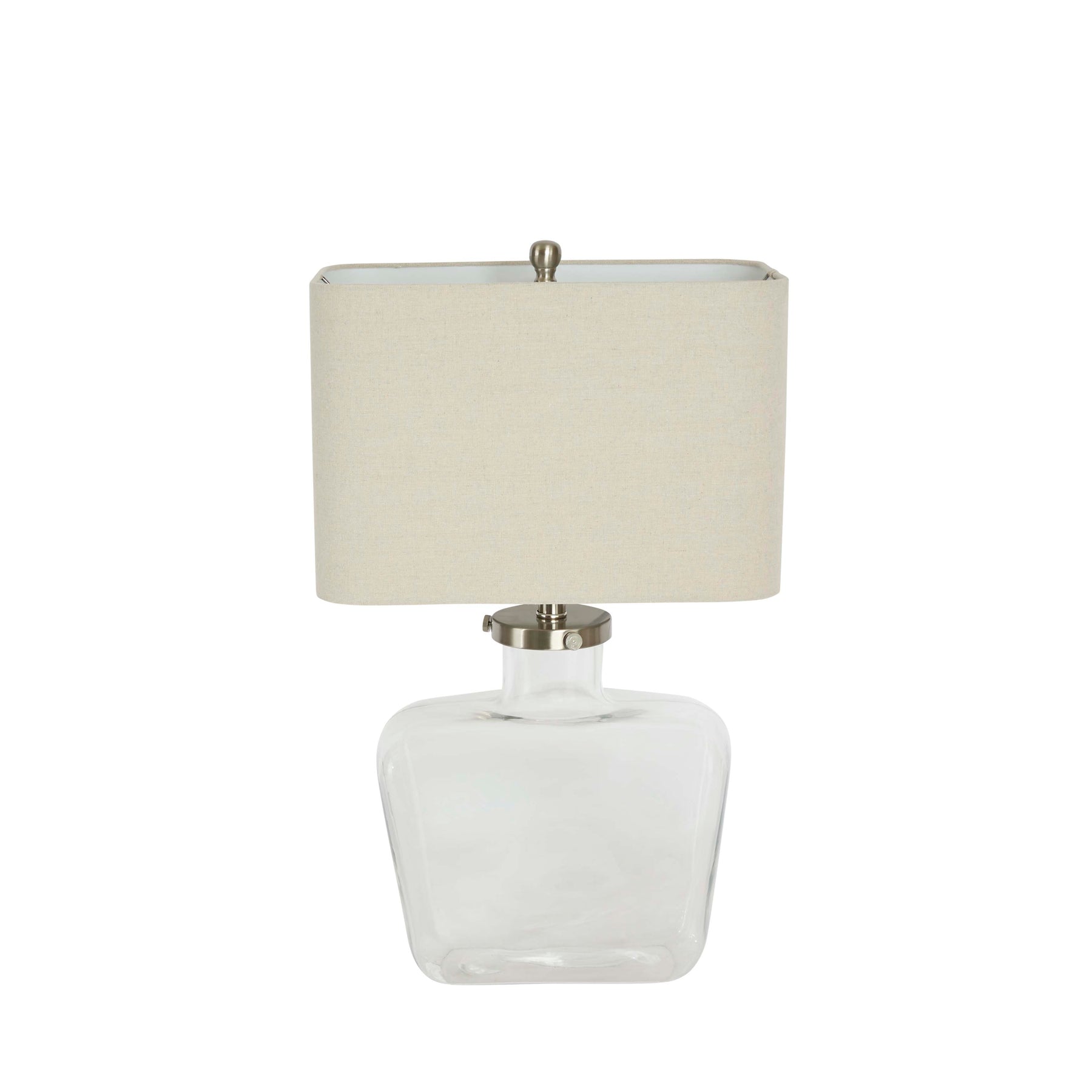 A versatile lamp is a smart choice for any home. This lamp is one that will work in your guest room, living space or on your hallway console, working well with any surroundings. Its understated look includes a modern clear glass base with polished metal accents, and a coordinating fabric drum shade