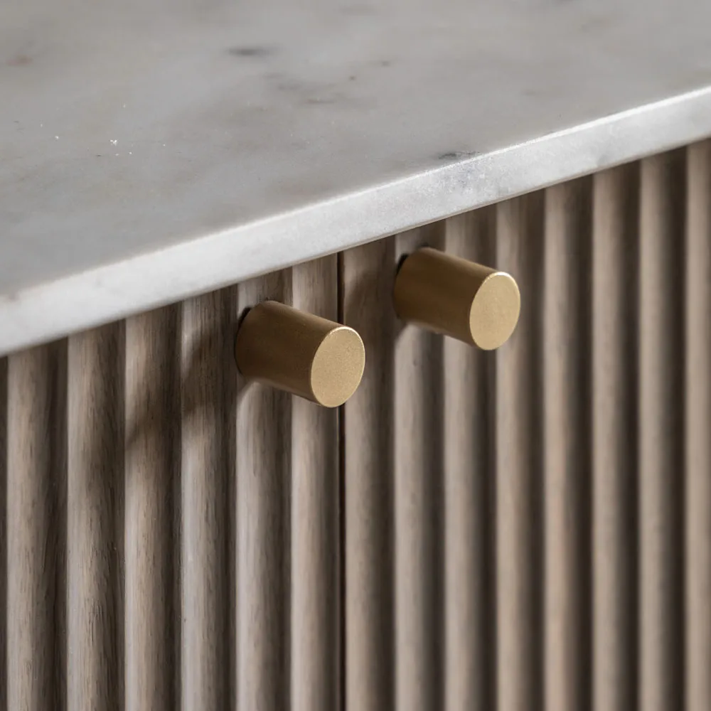 Offering a modern classic look, this stunning sideboard exudes timeless quality and beauty, whilst offering a practical storage solution. It is crafted from solid mango wood, with a striking vertical ribbed feature on the doors, and a polished Indian white Carrera marble top with classic grey/blue veins running through it. Matching pieces available.
