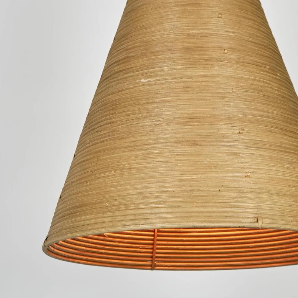 Over-scaled, striking conical shapes, in a range of 3 sizes. A statement on their own, or in large spaces can be clustered for maximum impact. Hand woven natural rattan on steel wire frame. Hanging pendant cord included.