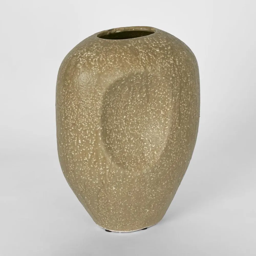 Bold in size and shape these hand-formed terracotta vessels, finished in a tactile and lively glaze in an earthen Olive hue, bring an organic feel to a space. Also available in Speckled white.
