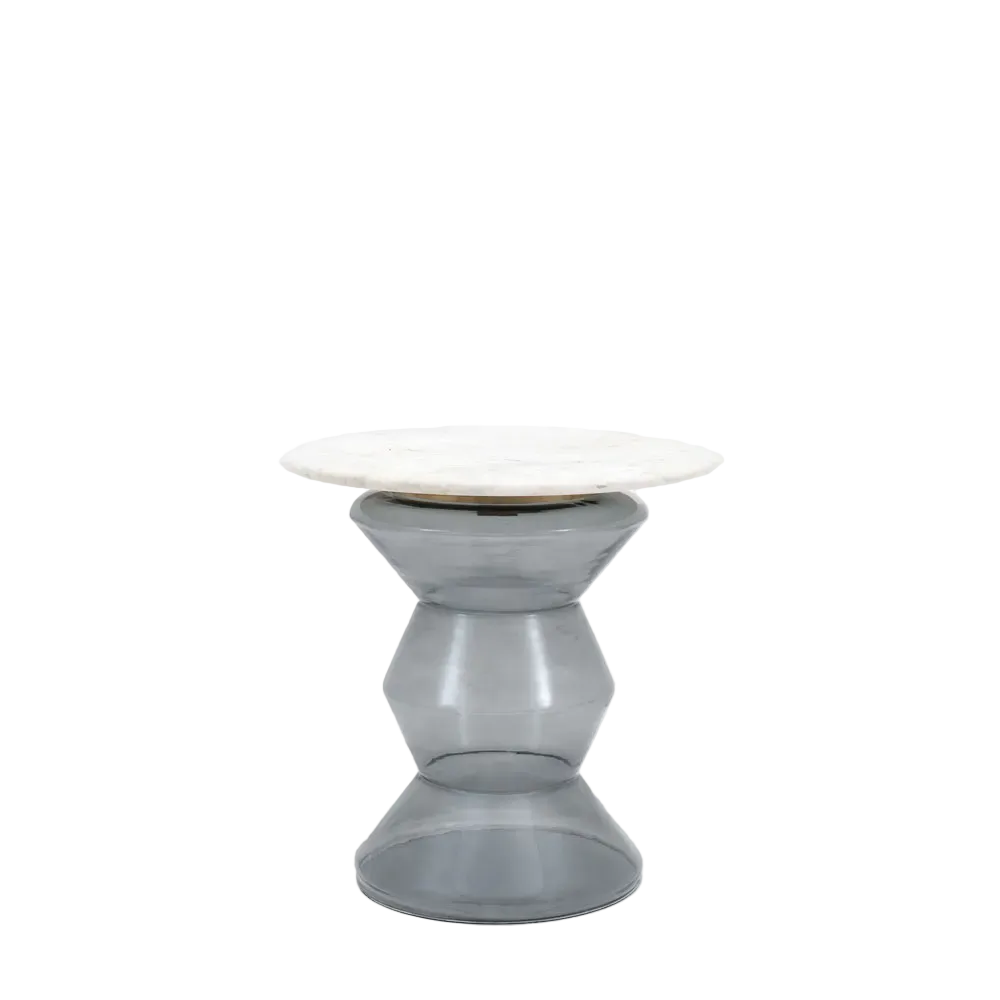 Bold and beautiful this glass based side table is definitely an eye catching peice of furniture. The shaped clear glass base is topped by a luxe white marble top with a bronze toned metal collar, creating a stand out table designed to add a bit of luxury to your room. Also available with a orange glass base.