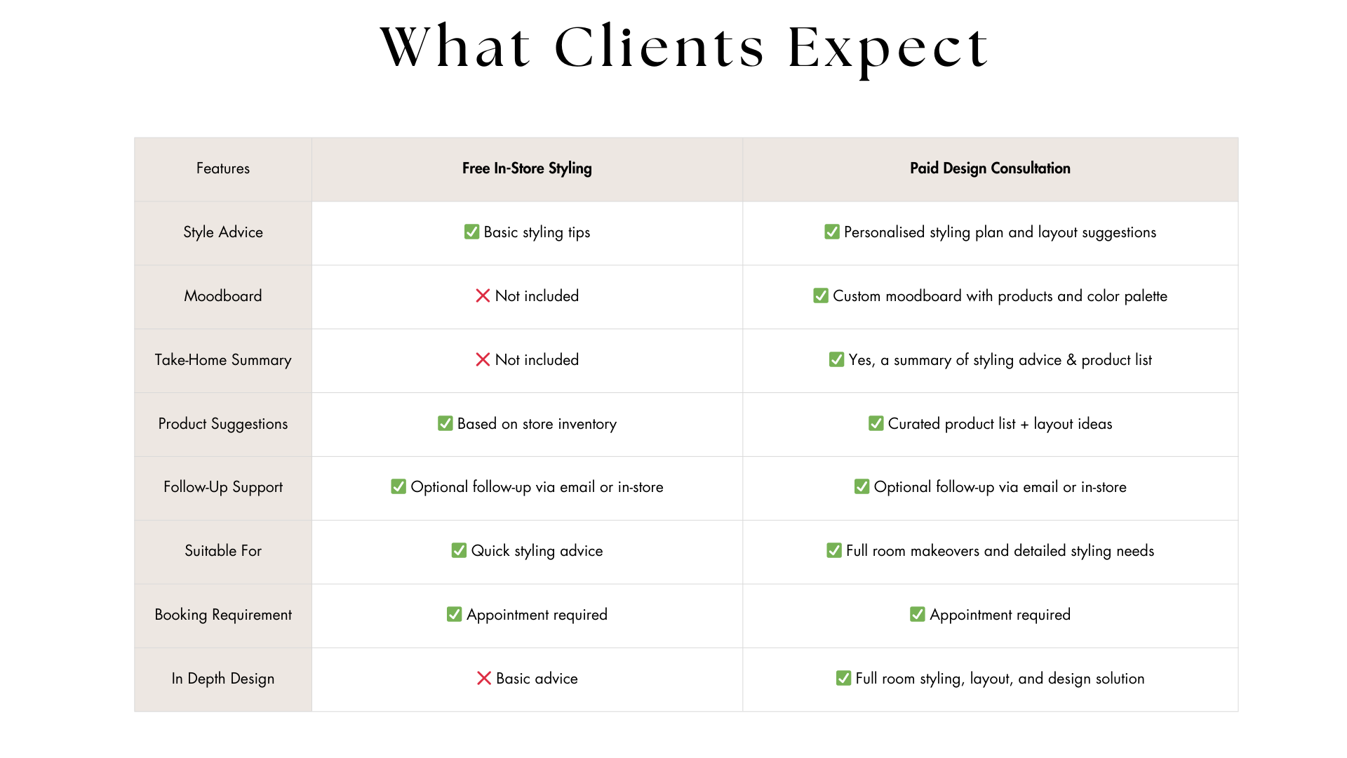 Once the $250 deposit is received, your consultation will begin. Our expert team will work with you to explore interior styling concepts and recommend the best pieces from our collection based on your space, needs, and design preferences.