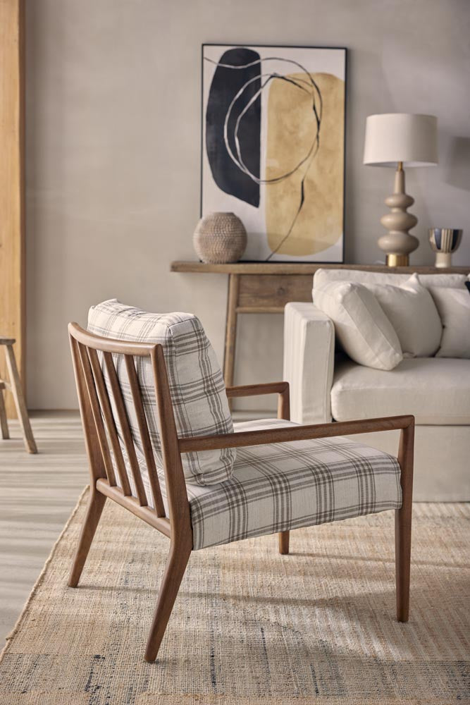 The Douglas Upholstered & Timber Armchair Plaid exudes a sense of sophistication and elegance. Its plaid cushions in a neutral palette add a touch of traditional comfort to any space. Crafted from rubber wood, this armchair features ladder back details that not only enhance its form, but also serve a practical purpose. The beautiful linen blend fabric further enhances its impeccable design.
