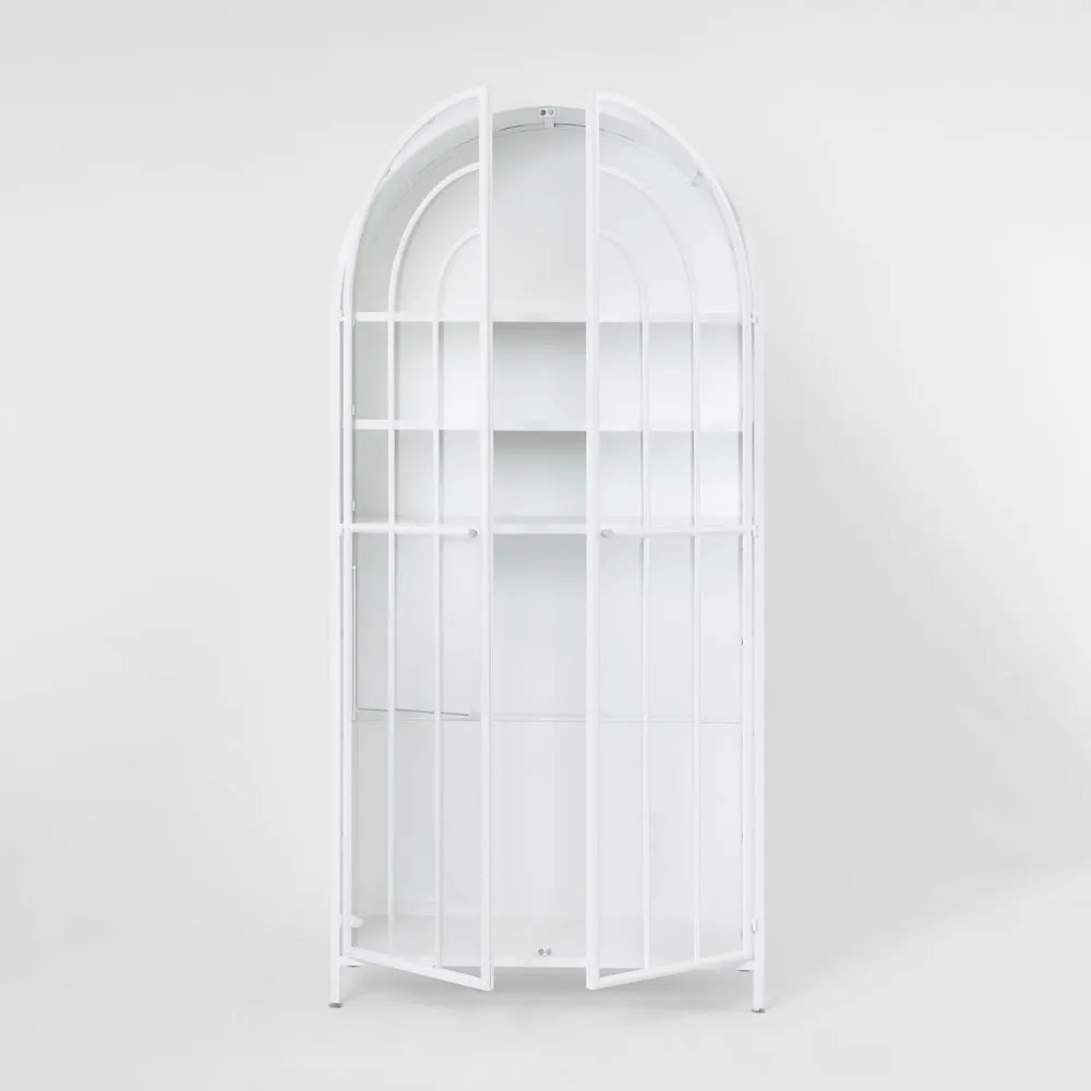 Metal cabinet with rounded arched top in striking white. Glass opening doors metal knobs, 4 internal shelves for storage.